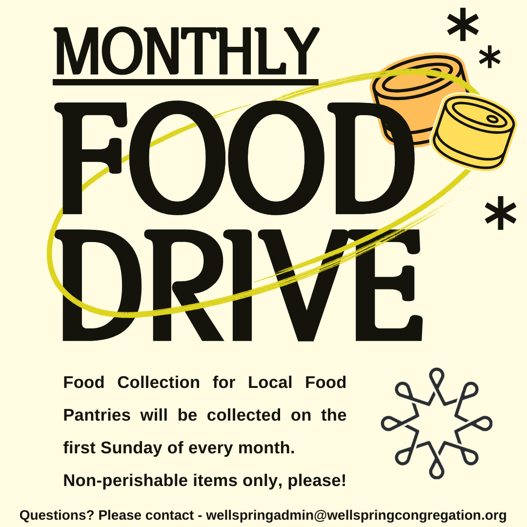 Every first Sunday of the month, we will collect non-perishable food items for a local food pantry. Please bring what you can. As we receive communion, we will offer our donations that will help others.